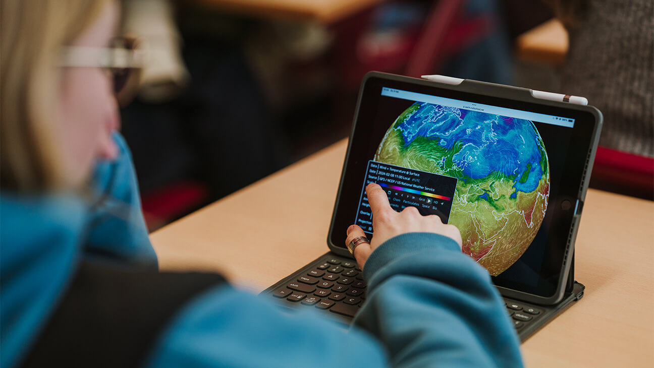 Meer dan 20 vijfdejaars Moderne talen en Latijn-Moderne talen gaan apart aan een tafeltje zitten, hun iPad in de aanslag. Er volgt een vragenrondje over de vorige lessen. Zonder beeld blijven begrippen als ‘aardrevolutie’ en ‘winterzonnewende’ behoorlijk abstract, maar daar wentelt de aarde al rond de zon op het scherm. In de gekantelde aarde zit een roze spiesje dat de aardas voorstelt. Het loopt door de geografische noord- en zuidpool.