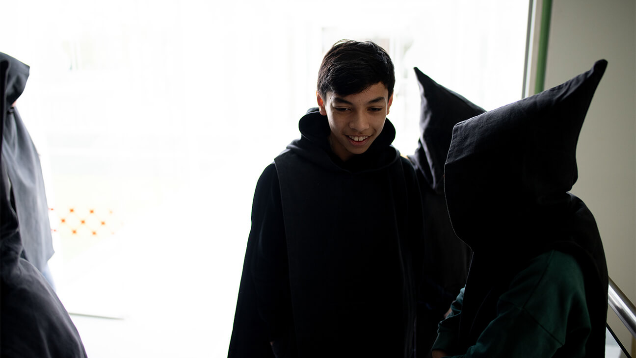 “Proberen we die regel van de stilte eens?”, daagt Marc ons uit. Juf Lien duidt Mats en Nayla aan als klasabt en -abdis. Zij lopen in het midden van de pandgang voorop, de andere leerlingen volgen muisstil in 2 rijen aan de zijkant. Als voorbeeldige novicen, de handen plechtig gevouwen, wandelen ze terug richting het museum.