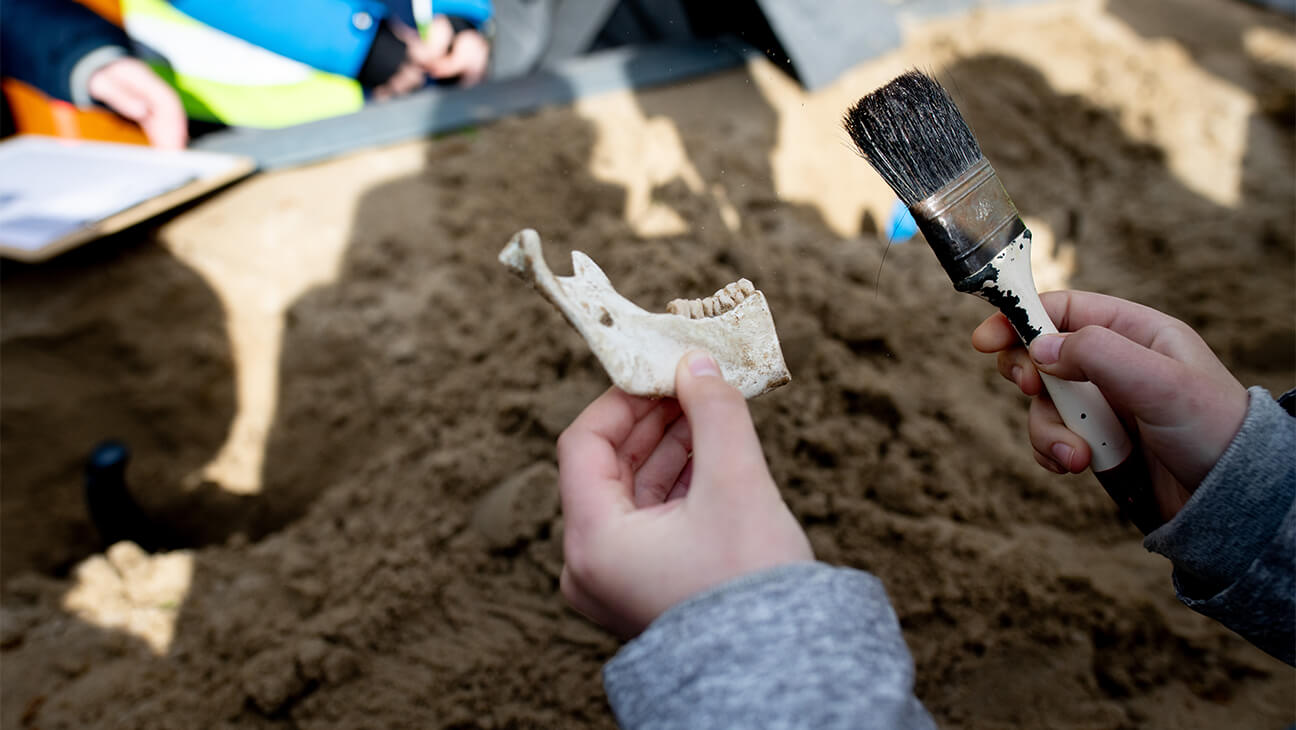 “Mijn schopje verdwijnt al bijna helemaal in de kuil.” Klara twijfelt of ze nog wel iets zal bovenhalen. “Hoe dieper je graaft, hoe ouder de overblijfselen”, moedigt Marc haar aan. Ze stoot op een gebit. “Archeologen hebben hier veel gezonde gebitten teruggevonden”, vertelt hij. “De abdijkeuken voorzag de monniken dus van goed voedsel.”