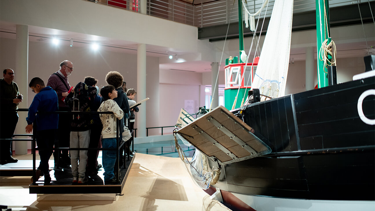 Vanuit de diepzee zwemmen we naar het oppervlak. “Zijn dat miniatuurschepen?” In de grote zaal tegenover de potvis werpen we ons licht op maquettes van vissersschepen. “Wat hebben deze schepen gemeen?” vraagt Johan. De oplettende kinderen zien zeilen, en hout.
