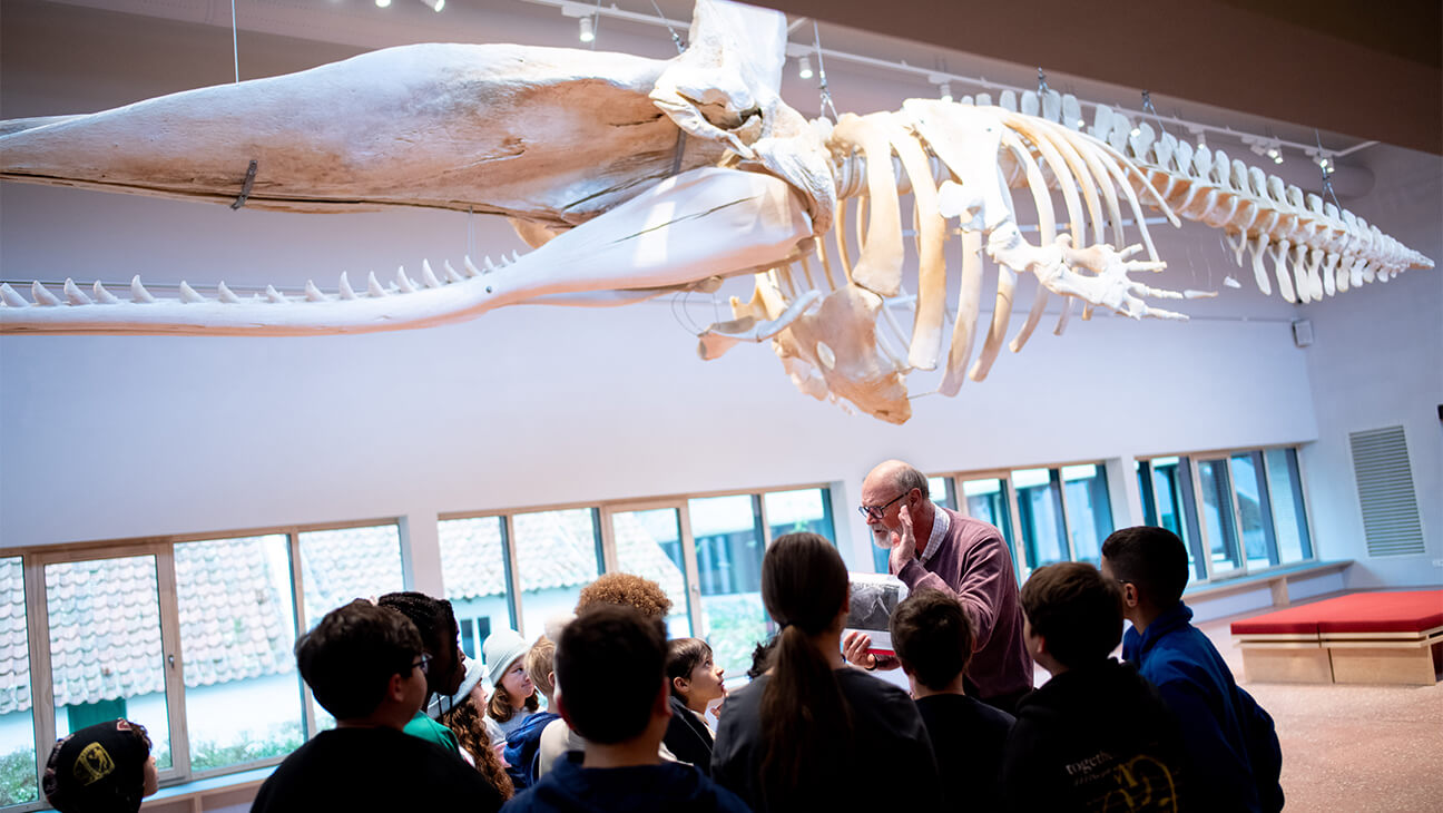 “’Navigo’ is Latijn voor ‘ik vaar’”, vertelt gids Johan bij de start van de klasuitstap naar NAVIGO Visserijmuseum. Dat het museum niet gaat over een hengeltje uitgooien in het kanaal, wordt meteen duidelijk in de grote inkomhal. Daar hangt het 13 meter lange skelet van een ‘speciale walvis’.
