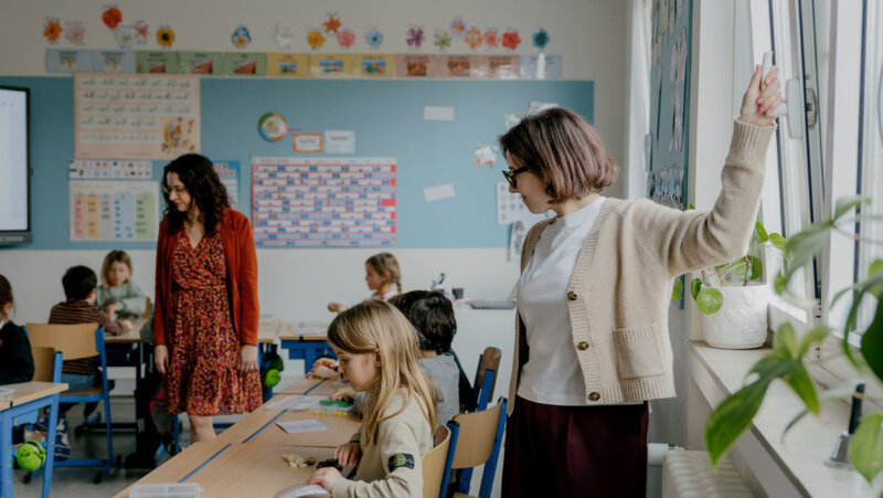 “Elk kind kort opvolgen in een klas van 24 is lastig. Met 2 voor de klas heb je meer marge. Soms lukt dat: de zorgjuf begeleidt dan een groepje intens terwijl ik door het lokaal loop en leerlingen ondersteun met tips en opmerkingen. Wat ik nog doe: leerlingen individueel bij me roepen. Wat is de hoofdgedachte, hoe vond je die? Of ik stel een stevige inhoudelijke vraag. Zo krijg ik een beeld van ieder kind. Daarnaast bekijken we of we leerlingen wat vaker iets op papier laten zetten.”