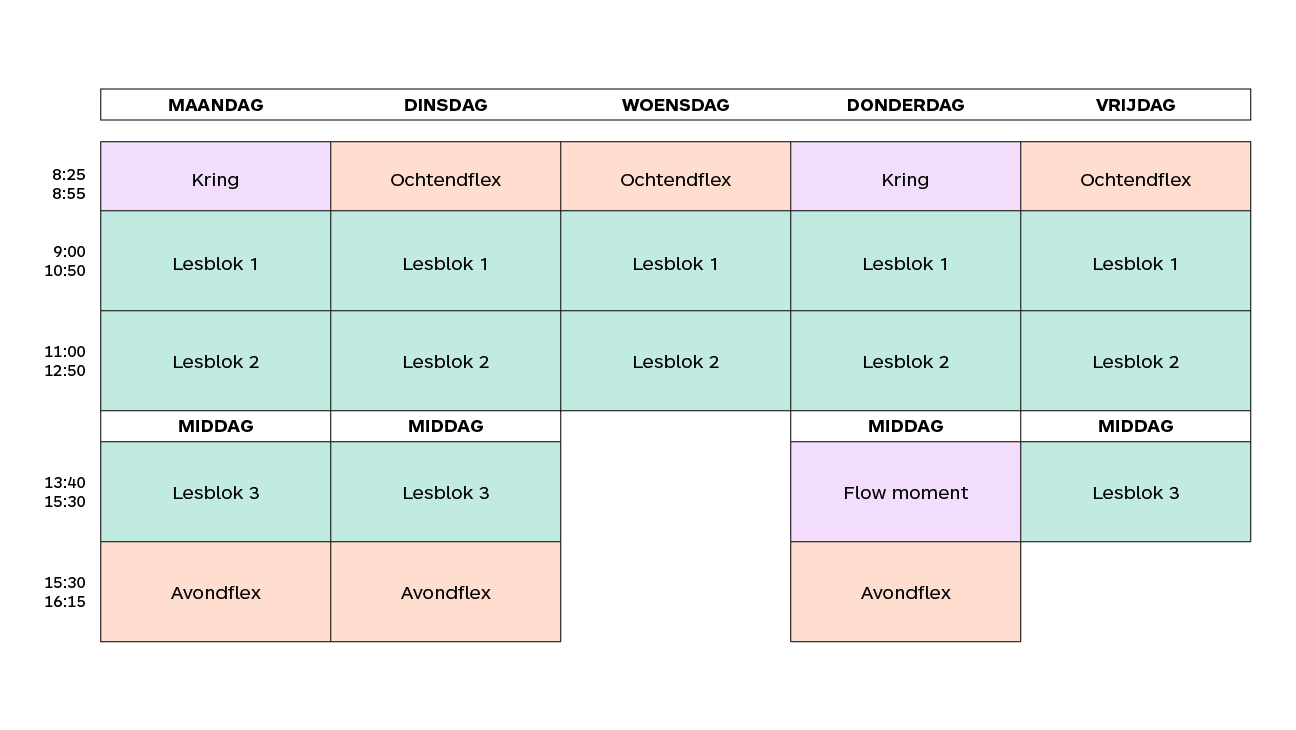 Nele Adriaenssens: “Ons lessenrooster is opgebouwd volgens de 3 taken van onderwijs van de pedagoog Gert Biesta. Je herkent ze aan de 3 kleuren in ons lessenrooster: groen voor ‘ik leer breed’, oranje voor ‘ik en de wereld en paars voor ‘ken jezelf’.”