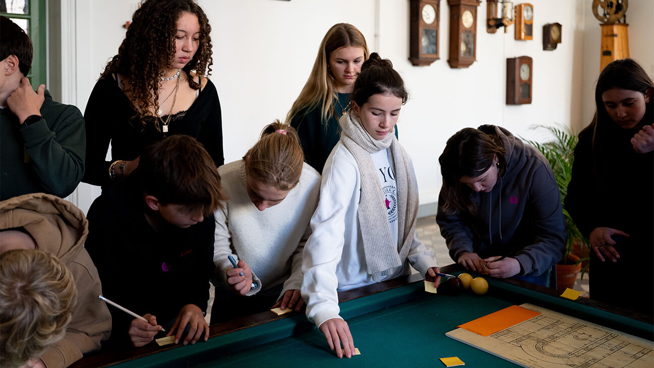 Gids Femke loodst de leerlingen op klasuitstap naar Museum Dr. Guislain naar de eerste kamer in het oude gebouw. Een lichtrijke en huiselijke ruimte, met een overdaad aan sfeervolle plantjes en een biljarttafel in het midden. Het museum heeft de expo ‘Eigen Huis’ in een nieuw en meer interactief jasje gestoken, op maat van scholen. De leerlingen mogen meteen aan de slag: “Waar staan we hier? Wat valt jullie op?” vraagt Femke. “Het lijkt een speelkamer!” lacht Victor-Louis. “Klopt, het is een ontspanningsruimte”, zegt Femke. “Dokter Guislain hechtte veel belang aan een huiselijk interieur: hij wou geen strenge en kille ruimtes, maar kamers die zorgzaamheid en zachtmoedigheid uitstralen.”