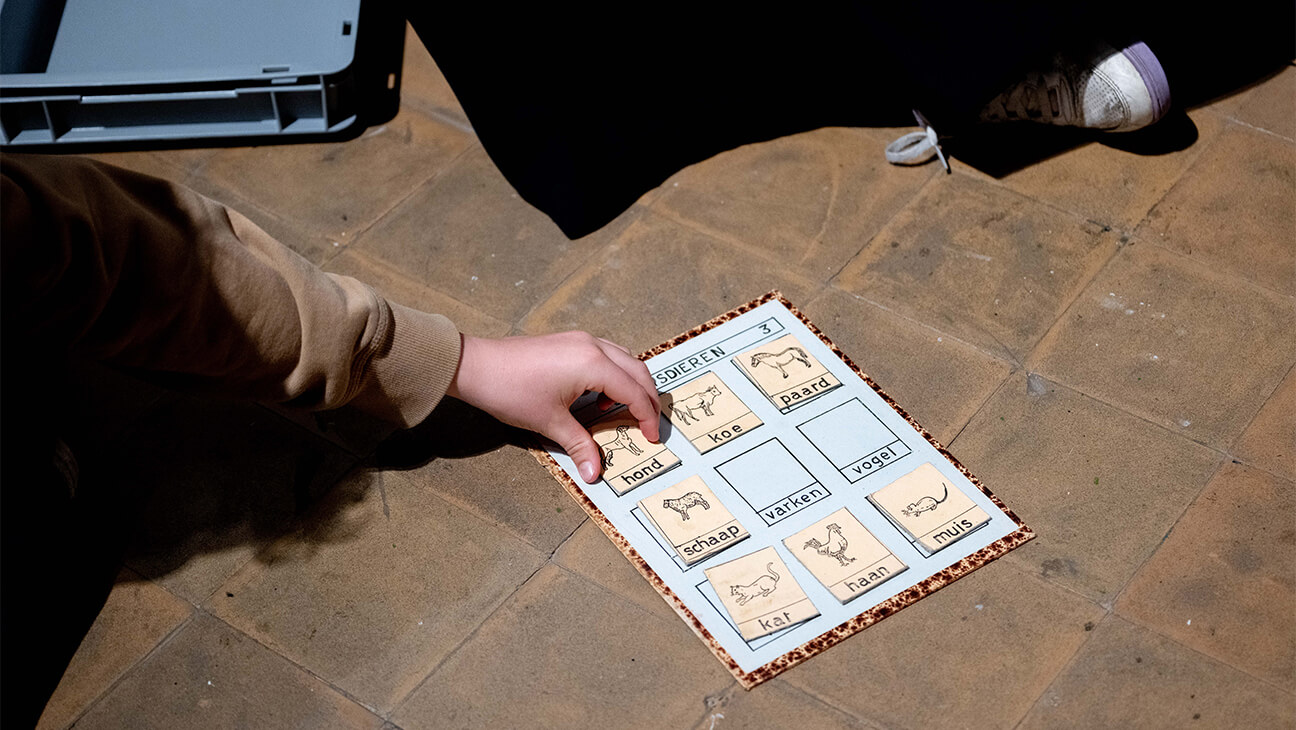 Even kruipen de leerlingen zelf in de huid van een kind met psychiatrische moeilijkheden. Ze ontdekken al spelend welke leermiddelen gebruikt werden om kinderen basisvaardigheden als spreken en tellen bij te brengen. Varianten op domino en telramen passeren de groepjes. Hoe moeten ze de spelletjes spelen? Oscar legt het spel van zijn groepje uit: “Je krijgt een kaartje met een afbeelding en de naam van een dier, en dan moet je die samenleggen op de juiste plaats op het bord. Zo konden de kinderen het dier zelf en de naam ervan leren visualiseren.” “Ik kan het zelf niet beter uitleggen”, lacht Femke.