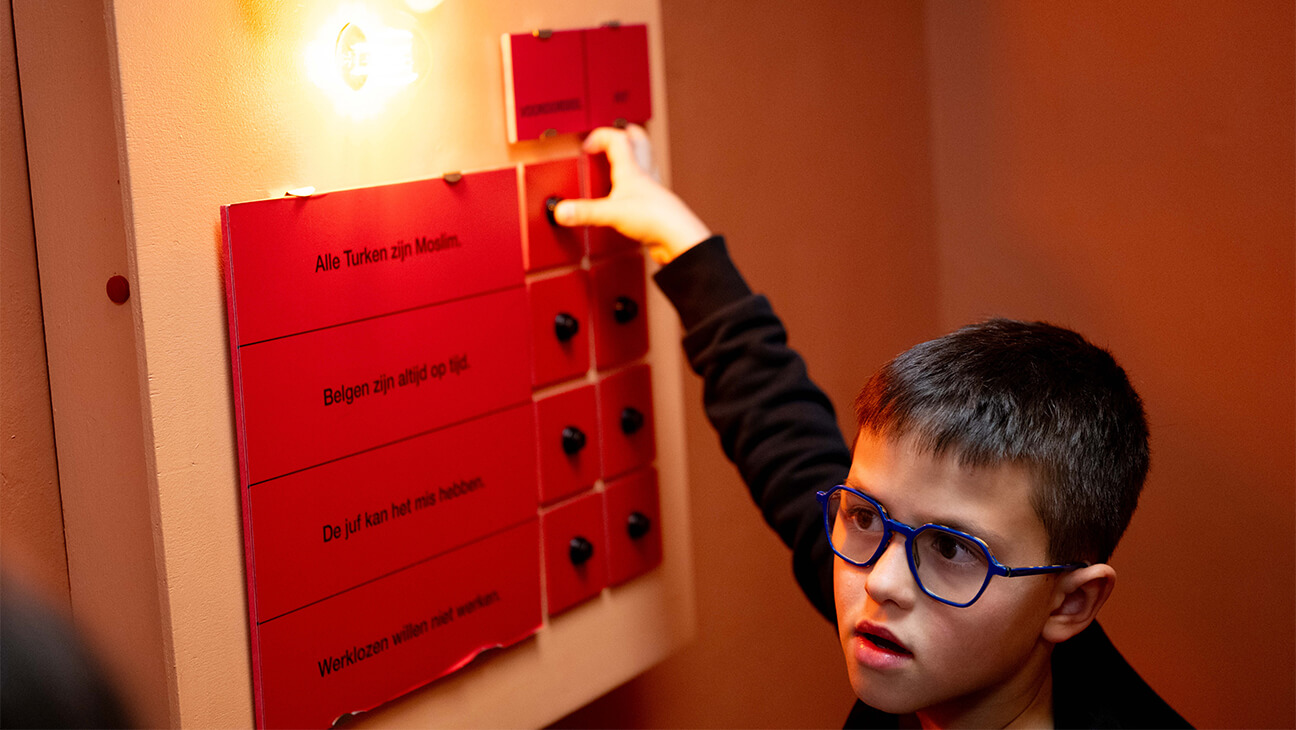 Ze leren ook het verschil tussen een vooroordeel en een feit tijdens hun klasuitstap naar het MigratieMuseumMigration. De leerlingen vullen vlijtig hun boekje in met vragen over diversiteit, zoals ‘je kan Belgen herkennen aan hun blanke huidskleur’, ‘alle Turken zijn moslim’, ‘werklozen willen niet werken’ of ‘roken is ongezond’. Sommige leerlingen hebben een duidelijke mening. Een knop brengt uitsluitsel: feit of vooroordeel.