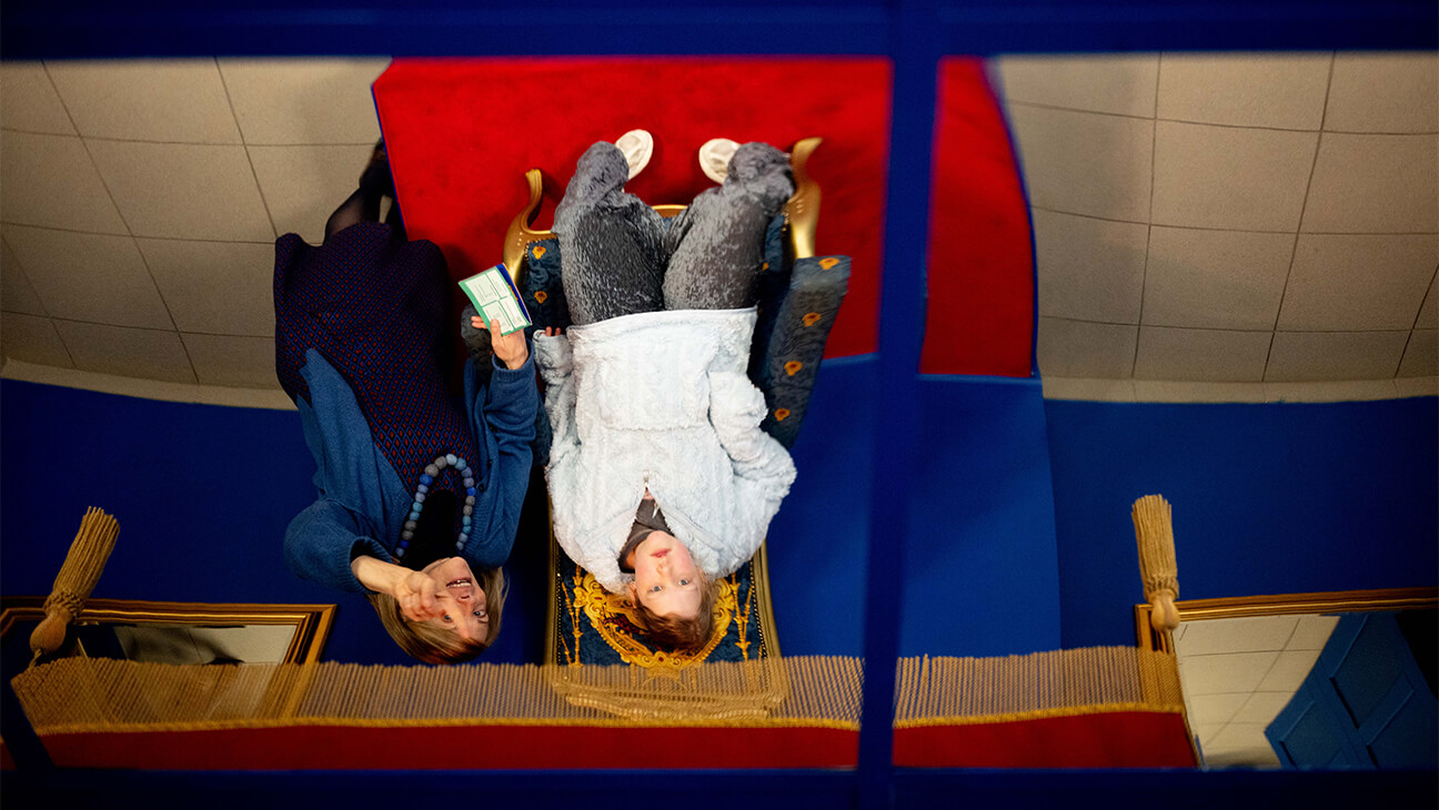 Koning Max heeft zich ondertussen op de troon geïnstalleerd en kijkt uit over de paleiszaal. “Kijk daarboven!” roept hij met een lach op zijn gezicht en wijzend naar de oplossing van de opdracht. Juf Inge maakt ondertussen wat leuke selfies met de leerlingen in de reflectie van de spiegels aan het plafond.
