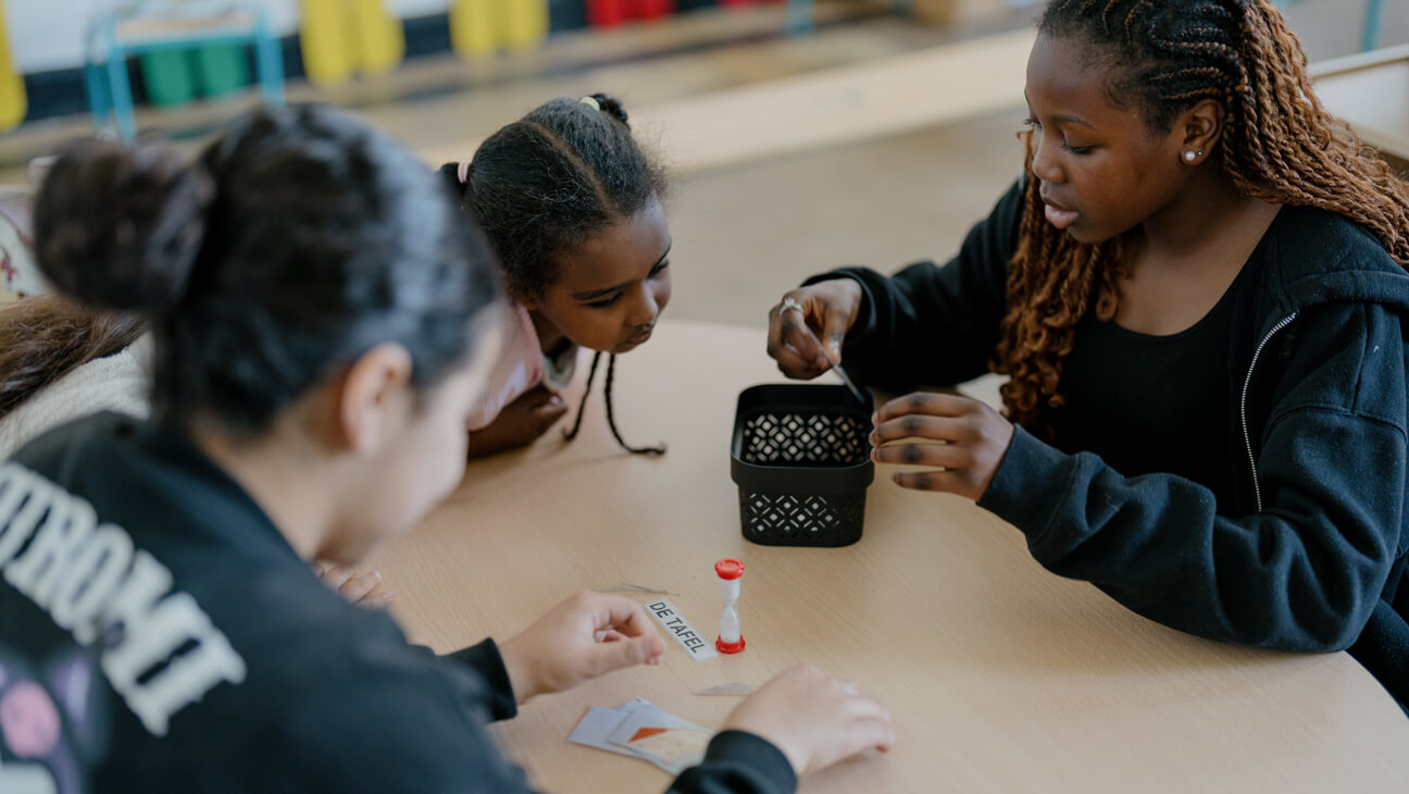 “Daarom kiezen we vanaf de derde kleuterklas voor een intensief taalbad van 4 halve dagen per week. Anderstalige kinderen uit onze verschillende scholen krijgen zo de kans om op eigen tempo Nederlands te leren. Na een jaar sluiten ze met een rugzak vol woordenschat en zelfvertrouwen weer voltijds aan bij hun klas.”
